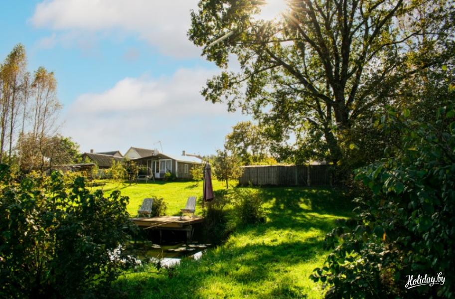 Дом-студия для 1-2 гостей с двуспальной кроватью, кухонной зоной, собственной печью, террасой, барбекю зоной, с видом на пруд и хвойный лес.