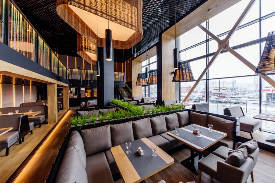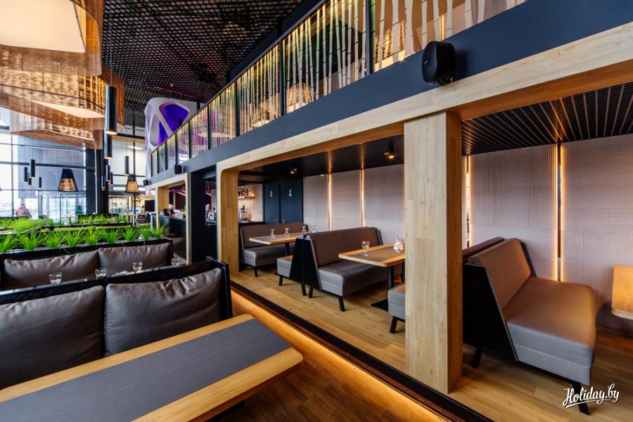 Интерьер заведения выполнен в приглушенных тонах с акцентами салатового цвета - диванами и зеленью. В зале имеется большая люстра, под которой расположена открытая кухня с поварами-сушистами.