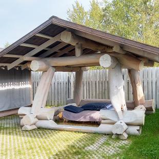 Особенность этой бани – чан с подогревом для отдыха под открытым небом. Вода в чане прогревается до 38-42 градусов, а при добавлении в неё трав можно наслаждаться потрясающим ароматом.