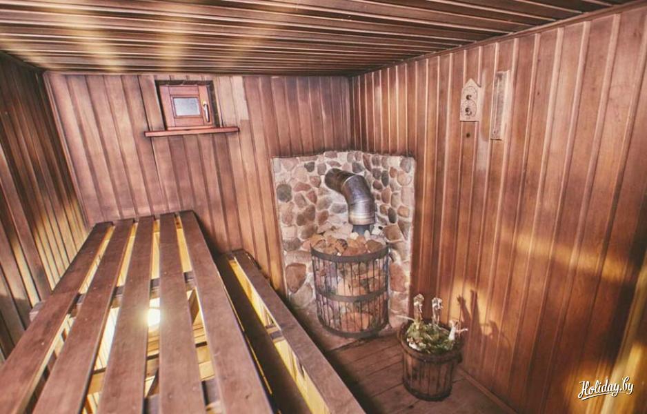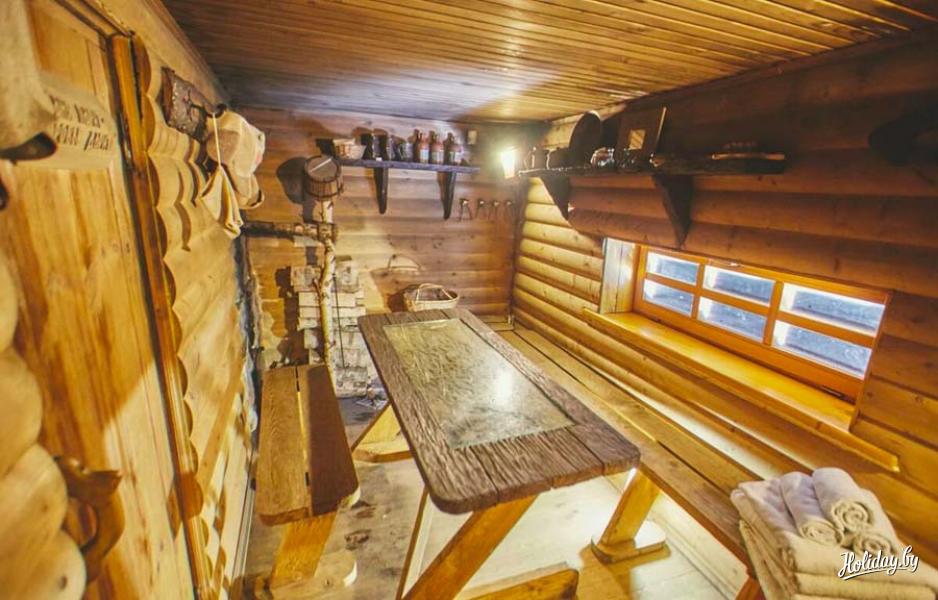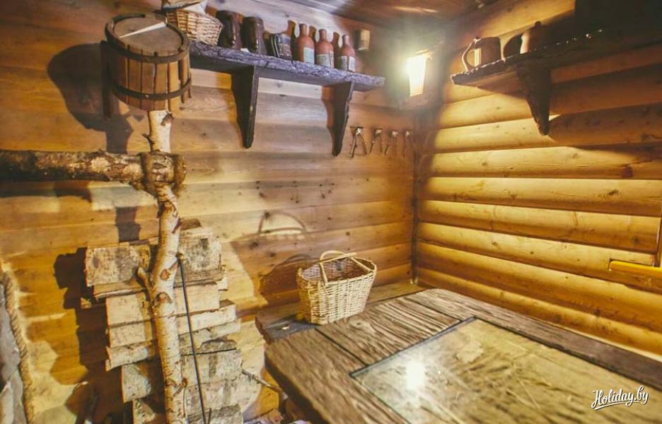Баня в агроусадьбе «Лосиный горб» на берегу реки Свислочь в 80 км от Минска – именно то место, где можно получить здоровый отдых в приятной обстановке вдали от городской суеты. Вас ждет русская баня с прекрасным видом на окружающий пейзаж. В бане есть предбанник со столиком и скамейкой, а также крытая терраса, куда после парных процедур душевной компанией можно переместиться на вечерний ужин – отведать свежеприготовленного ароматного шашлыка за бокалом красного вина. Рекомендуется посетить баню до наступления темноты, поскольку, выйдя на свежий воздух после парилки, вы сможете наблюдать за прекрасной картиной природы – как за реку и поля садится вечернее солнце.