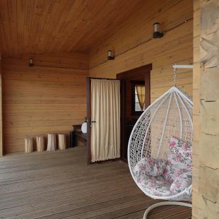 Особенность этой бани – чан с подогревом для отдыха под открытым небом. Вода в чане прогревается до 38-42 градусов, а при добавлении в неё трав можно наслаждаться потрясающим ар...