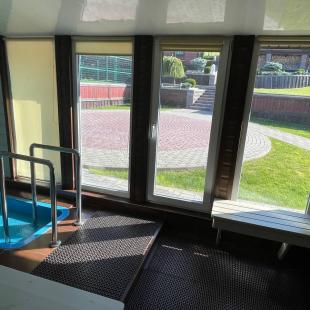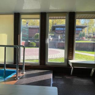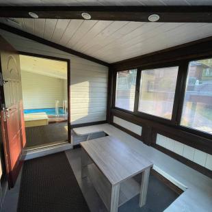 В двухуровневом доме-бане есть оснащенная кухня, гостиная с спутниковыми каналами, парная на дровах, купель и санузел. На втором этаже находится спальня.