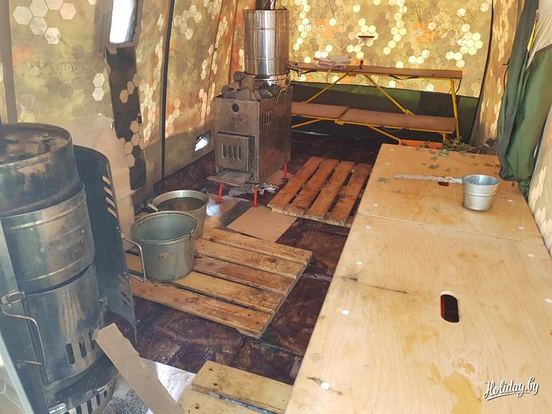 Такая баня не только не отстает по своим целевым свойствам от обычной бани, но по некоторым характеристикам превосходит ее. Материал палатки изготовлен из прочных влаго- и жаропрочных материалов, внутри оборудована настоящая печь, при эксплуатации которой используется экологически чистый материал — древесный брикет. Каждый, кто хоть раз принимал участие в растопке загородной бани знает, что дело это довольно хлопотное, а процесс до получения качественного пара занимает несколько часов. Так вот, чтобы достичь температуры в 120 градусов Цельсия в мобильной бане требуется всего 30 минут. Здесь вы можете париться с веником или же отдыхать, нежась в теплых клубах пара. Такая баня хорошо снимает напряжение и подходит всем активным людям как дополнительное средство поддержания здоровья и красоты.