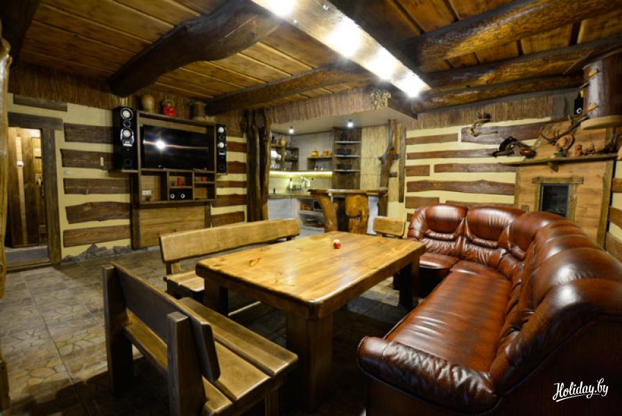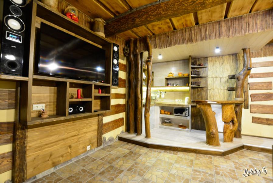 Комната отдыха оборудована столом и диванами, телевизором, DVD, аудиотехникой, а также камином. Есть также кухня со всей необходимой посудой.