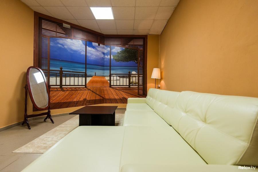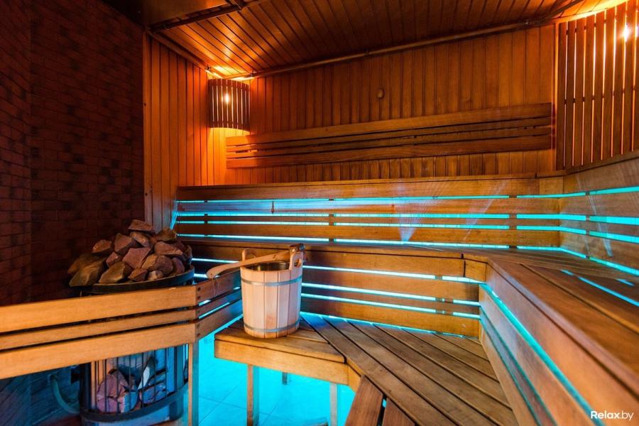 Сауна разделена на несколько зон для отдыха. Просторный банкетный зал оборудован длинным столом с удобными стульями и бильярдом, акустическая система и жидкокристаллический телевизор – все это позволяет разместиться большой компании и устроить зажигательную вечеринку. Рядом расположена комната отдыха, выполненная в светлых тонах, предназначенная для релаксации и сна, где вы можете отдохнуть на мягком белом диване. В сауне также предусмотрено место для курения.