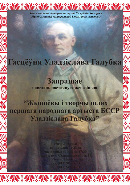 Художник-декоратор, режиссер, актер, Владислав Голубок давно стал культовой фигурой в искусстве Беларуси. Этот уникальный человек был не только основателем Национального театра, но и талантливым писателем-драматургом. Творческое наследие Голубка составляет сорок пьес, из которых одна только «Ганка» ставилась 498 раз еще при жизни своего создателя! Фарсы, комедии, мелодрамы, водевили – этому автору покорялись все жанры. Неудивительно, что «Труппа Голубка» через несколько лет после своего основания стала Третьим белорусским государственным театром. К сожалению, НКВД и советское правительство не смогло простить Владиславу Иосифовичу его успеха и таланта. В 1937 году он был расстрелян по обвинению в национализме. Сколько бы еще великих произведений могло быть создано, на какую бы высоту поднялся театр Беларуси при Голубке? Нам остается только сожалеть о потери такой исключительной личности в национальной культуре и чтить его память, посещая галерею.