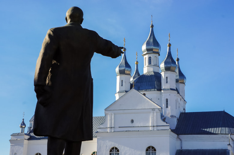 Находится он в самом центре площади, по традиции возвышаясь над всеми проходящими мимо. Выполнен в традиционной технике, основу скульптуры составляет гранитный пьедестал почти такой же высоты, как и сам монумент. Вождь революции протягивает руку, как бы направляя горожан на путь, который ведет к светлому будущему. Однако по иронии, или даже, скорее, насмешке судьбы, один из самых известных атеистов своего времени указывает прямо на Спасо-Преображенский собор. Дело в том, что во время монтажа памятника церкви на площади просто не было. Основанная в XVI веке, она сильно пострадала во время бомбежек Великой Отечественной войны, и в 1963 году была полностью демонтирована. Возрождение святыни началось лишь в 1994 году, с благословения Новогрудского архиепископа. И только после завершения строительства стало очевидна нелепость такого соседства. Сегодня это любимый ракурс для фотографий туристов: Ленин, изо всех сил стремящийся к православному собору.