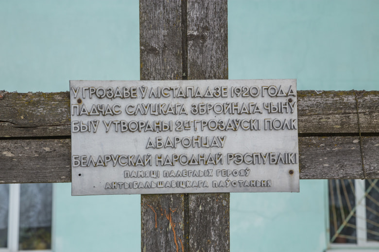 Крест в четыре метра высотой имеет на верхней перекладине табличку из металла. Любой турист, приезжающий на отдых в Минскую область, на памятном знаке с изображением герба «Погоня», прочтет следующие строки: "У Грозаве у лістападзе 1920 года падчас слуцкага збройнага чыну быў утвораны 2-гі грозаўскі полк абаронцаў Беларускай народнай Рэспублікі. Памяці палеглых герояў антыбальшавіцкага паўстання".