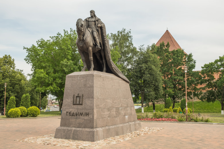 Гедимин считается основателем города Лида – шестиметровая скульптура весом более 2,5 тонны была установлена на постамент у замка во славу великого князя. Взору открывается величественный бронзовый всадник на коне. Постамент облицован гранитом в цвет Лидского замка. На нем есть надпись «Гедымiн» и изображение геральдического знака Великого княжества Литовского – «Калюмны».