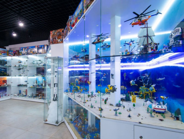 Экспонаты представлены на просторной территории в 487 кв.м. В музее имеется несколько залов с экспонатами, которые размещены по сериям и годам выпуска, а также отдельные залы с сериями StarWars, Technic, Friends и интерактивный макет "Город", который полностью выполнен из Lego. В консольной комнате посетители смогут поиграть в видео-игры производства Lego, а также провести время в игровой зоне.