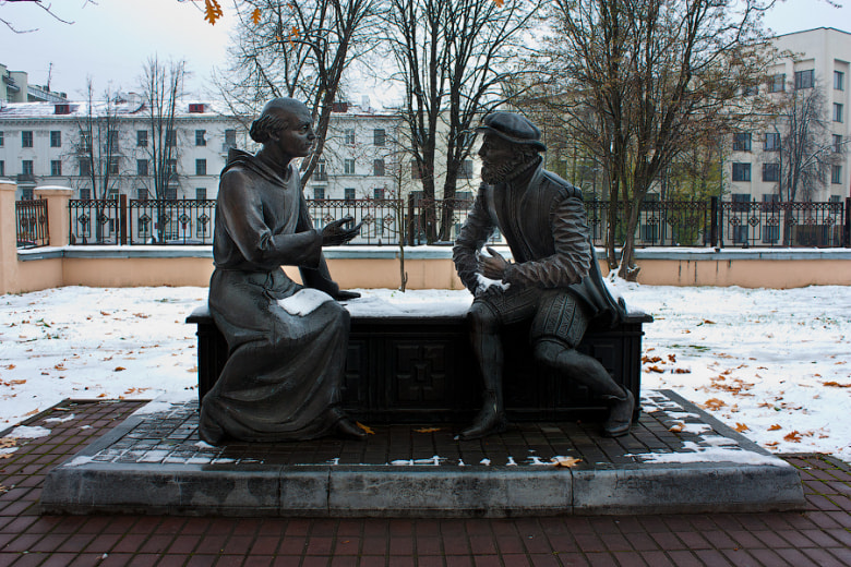 Памятник представляет собой двух людей, сидящих на скамейке и спорящих о чём-то. Это Василий Тяпинский и Симон Будный. О чём спорят эти два великих белоруса не знает никто. Но каждый может дать свой ответ. Симон Будный впервые издал на белорусском языке «Катехизис», Василий Тяпинский – Евангелие. Может быть, они продолжают спор, начатый 450 лет назад?