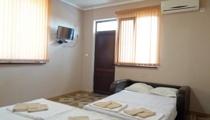 Туалет, умывальник, душ, односпальные или двуспальная кровати, шкаф, пуфики, прикроватные тумбочки, туалетный столик, вешалка, зеркало, сплит-система, телевизор, холодильник.