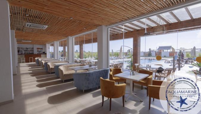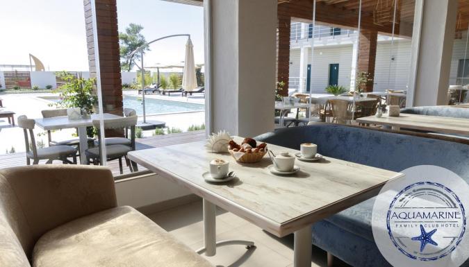 По утрам в отеле «Аквамарин Фэмили Клаб» подают континентальный завтрак или завтрак «шведский стол». Ресторан специализируется на блюдах европейской кухни.