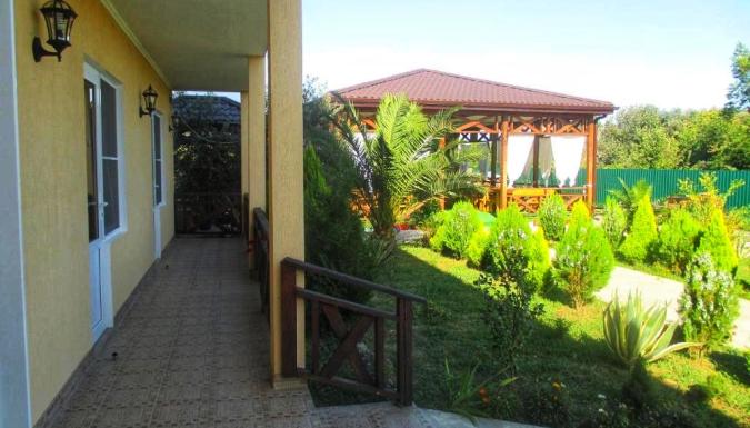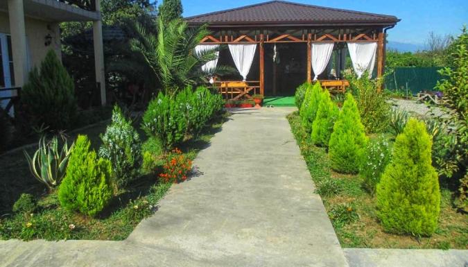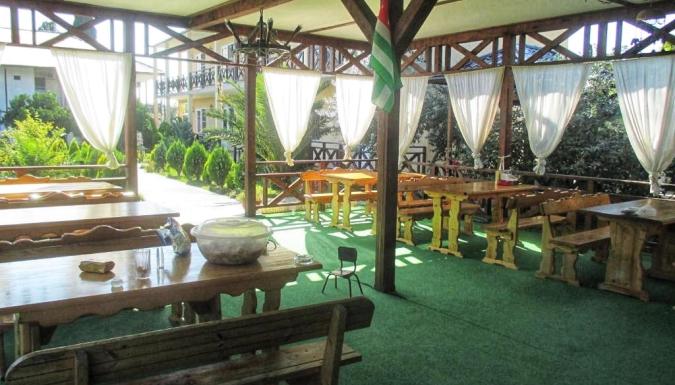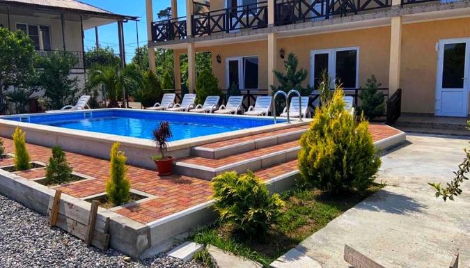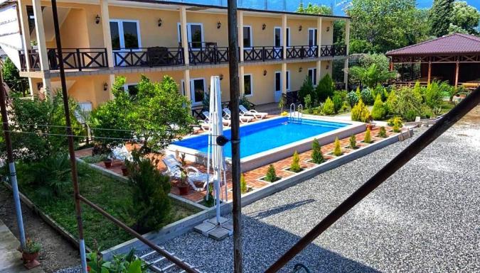 Красивый, современный гостевой дом расположен в экологически чистом месте, прямо в центре Алахадзе, Пицунда, с потрясающими видами на горы Абхазии! Расстояние от моря приблизительно 15-20 минут пешком. На территории расположен большой открытый БАССЕЙН, есть зона барбекю с мангалом, недорогая столовая (около 750 рос. рублей 3-разовое питание) и бар возле бассейна.