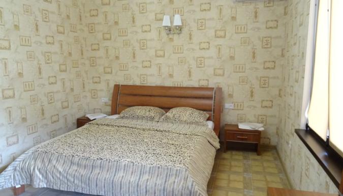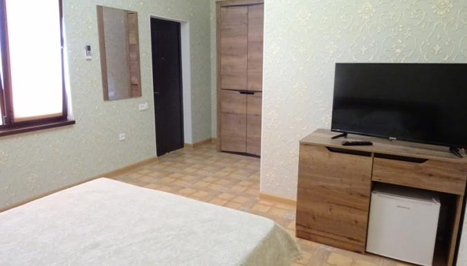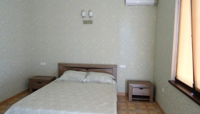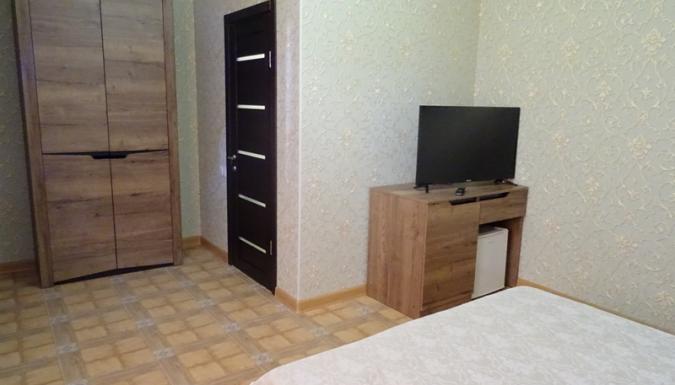 двуспальная кровать, шкаф, прикроватные тумбочки, туалетный столик, вешалка, зеркало, в некоторых номерах есть мини-холодильники