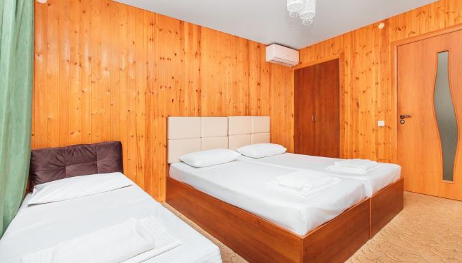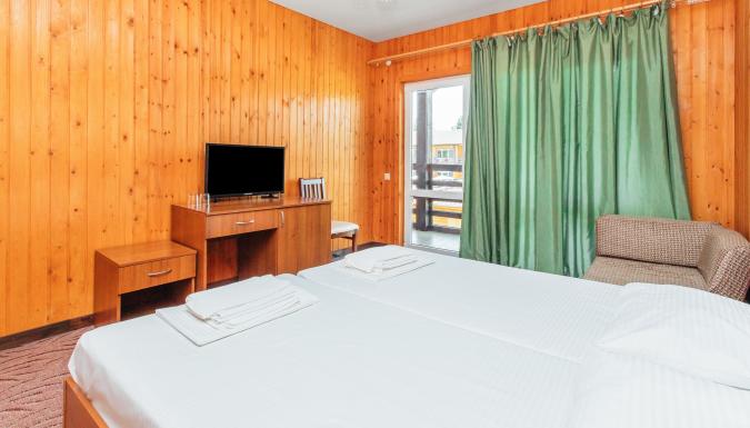 Балкон, кровати, шкаф, стол, стул, душевая кабинка, санузел, комплект полотенец, постельное белье, телевизор, кондиционер, холодильник, фен, туалетная косметика (шампунь, гель для душа,мыло, тапочки)