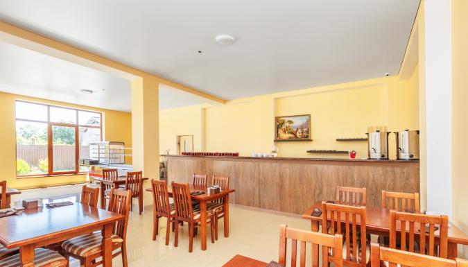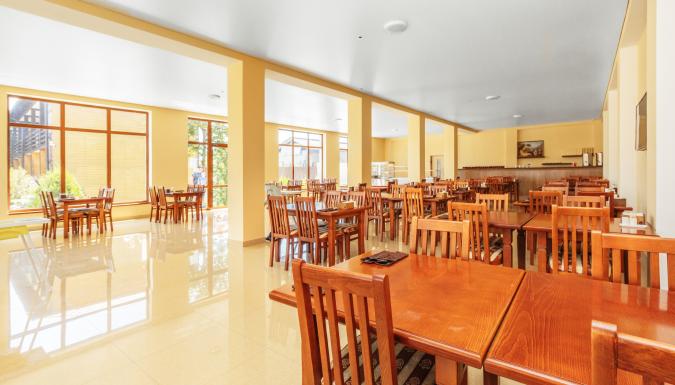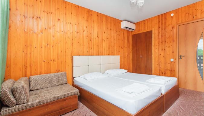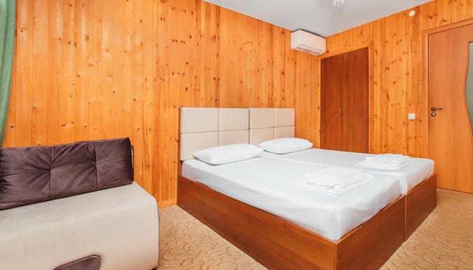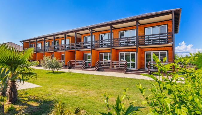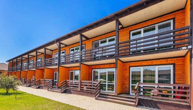 Корпуса отеля выполнены из натурального дерева. Номера на первом этаже имеют собственный вход.