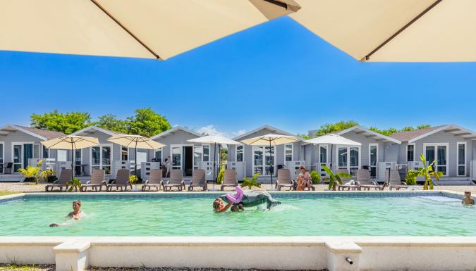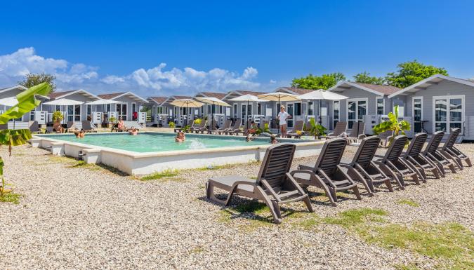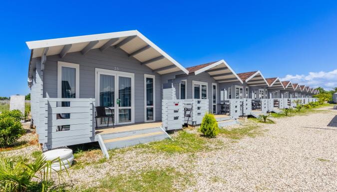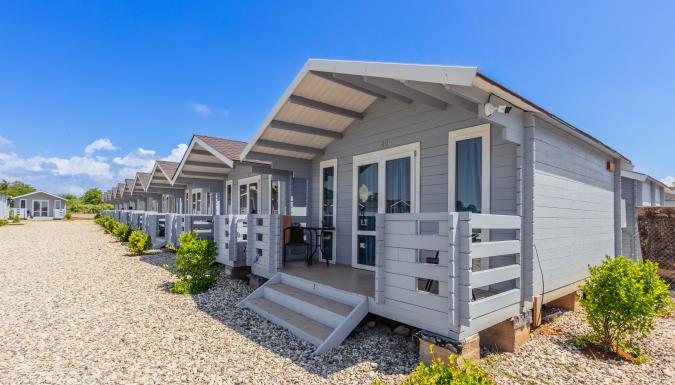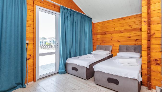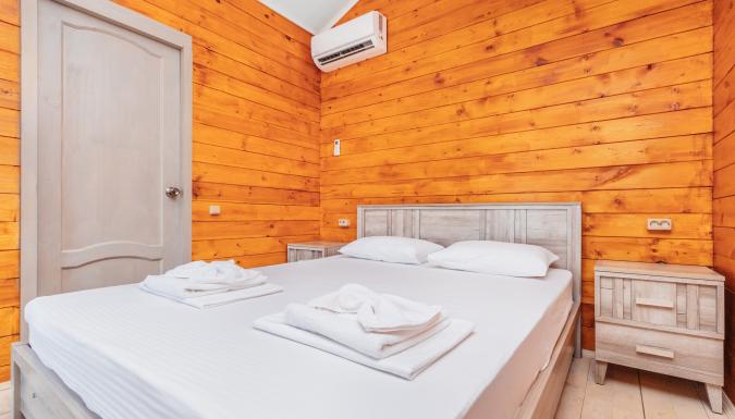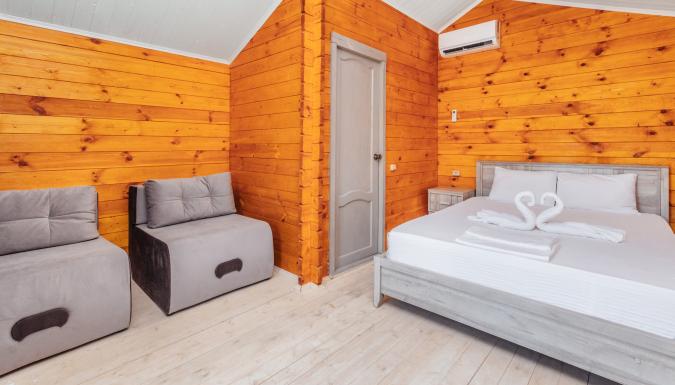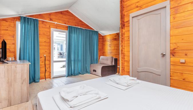 Номерной фонд отеля – 100 отдельно стоящих деревянных домика с отдельным входом.