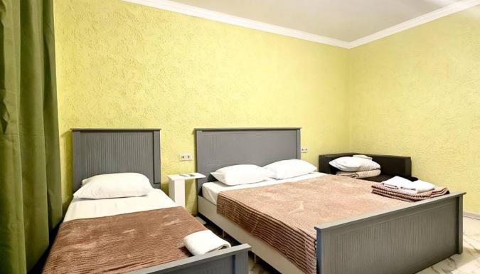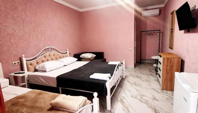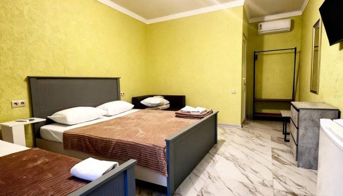 В нашем гостевом доме доступны номера на двух, трёх и четырёх человек с удобствами. В каждом номере есть вся необходимая мебель, кондиционер, цифровое телевидение, душ, туалет, холодильник, фен, постельное бельё и полотенца. В каждом номере — отдельный вход и общий балкон.