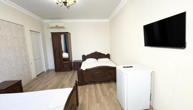 3-х местный : душ, туалет, общий балкон, кондиционер, телевизор, холодильник, двуспальная + односпальная кровати