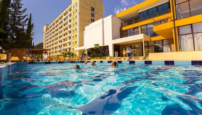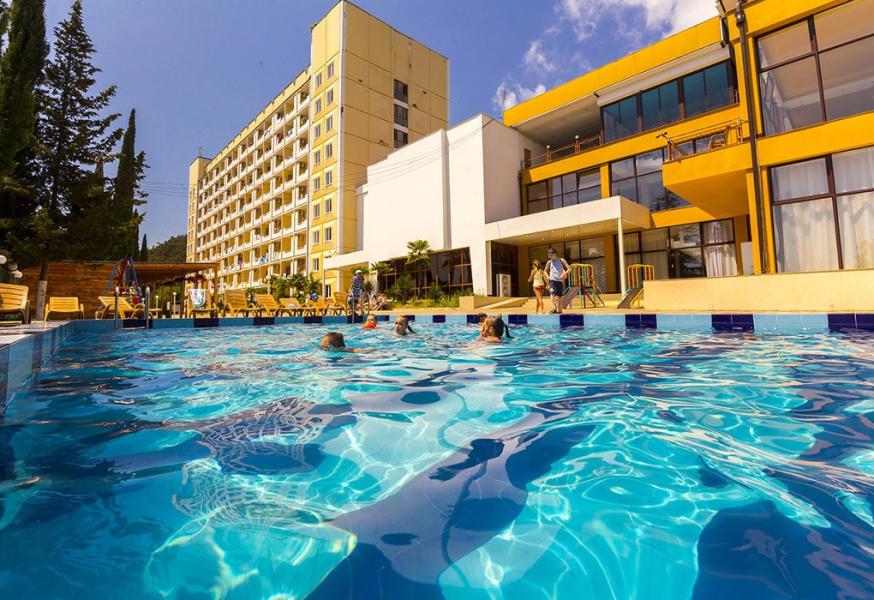 Пансионат «Багрипш» состоит из трех корпусов. Комфортабельные номера, оснащены всем необходимым. Один из немногих пансионатов Абхазии, предлагающий отдых с питанием «все включено». На территории пансионата есть два открытых подогреваемых бассейна, бильярд, настольный теннис, тренажерный зал, экскурсионное бюро. Общекурортный галечный пляж находится всего в 200 метрах, спуск к морю на лифте и через подземный переход.