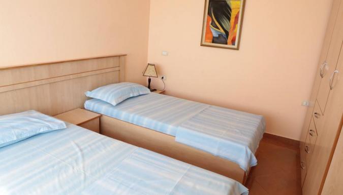 Apartament 1+1 двухкомнатный апартамент, состоящий из спальни и кухни. В спальне 2 односпальные кровати, которые можно соединять вместе. В кухне - односпальная кровать. Максимальное размещение - 3 взрослых. Всего в отеле 2 апартамента 1+1.