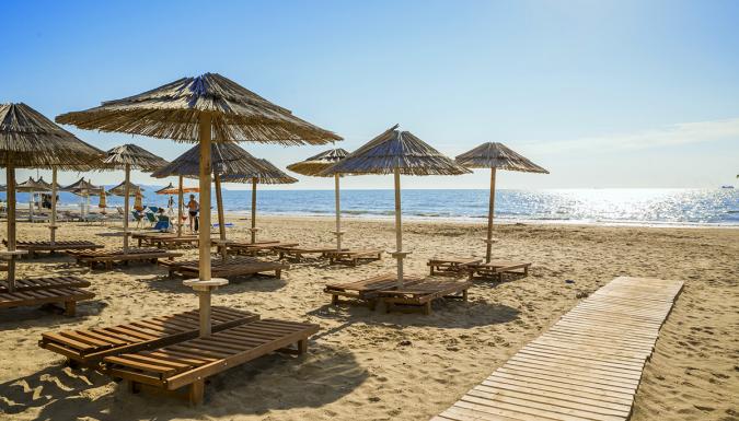 общедоступный, отведена часть для отеля, песчаный, пологий спуск к морю, ок. 50 м от отеля, к пляжу можно дойти по общедоступной дороге, бесплатные зонты и шезлонги, набережная с магазинами, барами и ресторанами.