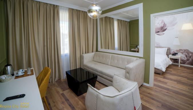 телевизор, кондиционер, телефон, мини бар, 2 тумбочки, шкаф, сейф. Есть балкон: стол и 2 стула на балконе. Ванная комната: душевая кабина, душевые принадлежности. Уборка номера (ежедневно). Смена постельного белья(раз в два дня).