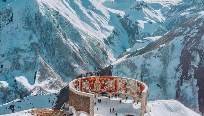 Смотровая площадка Арка Дружбы народов, где открывается потрясающий вид на ущелье Арагви и самый бесподобный вид на круглую гору Микети;