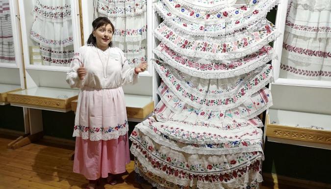 Западное Полесье Беларуси разделено на области, одной из которых является Загородье. Эта удивительное место, где сочетаются необычные пейзажи и уникальная этнография. Традиции Загородья бережно хранятся в знаменитом БЕЗДЕЖЕ — полесской деревне, известной с 1409 г. Пройдя через испытания XVIII в. — Северная война, столкновение между барскими конфедератами и казаками — Бездеж тем не менее стал королевским имением. Здесь регулярно проводились ярмарки, на которые съезжались жители окрестных деревень. Историю и традиции местных жителей сегодня хранит музей БЕЗДЕЖСКИЙ ФАРТУШОК — единственный такого рода музей в мире. Здесь собрана богатая коллекция — свыше 350 экземпляров — богато вышитых, с неповторяющимися узорами праздничных фартушков. В музее Вы узнаете о том, как создавались и создаются полотна для фартука, удивитесь фантазии полешучек при создании чарующих узоров. Вас также ожидает показ народного промысла, прогулка по крестьянскому ПОДВОРЬЮ "КАЛЯ ПЛЭСА", катание на бричке, музыкальное сопровождение и… ДЕГУСТАЦИЯ бездежской кухни. ОБЕД. Здесь мы попробуем: домашний хлеб, домашние колбаски и сало, тушеную с мясом картошку и драники, огурчики из бочки и квашеную капусту, блинчики с творогом и фирменный компот.