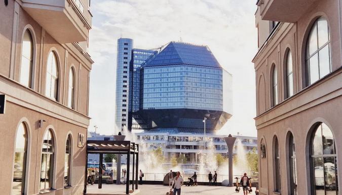 Далее мы осмотрим знаменитое здание НАЦИОНАЛЬНОЙ БИБЛИОТЕКИ Беларуси. Архитекторы В.Крамаренко и М.Виноградов придали зданию необычную форму — ромбокубоктаэдр высотой почти 74 метра. Необычной является подсветка здания, представляющая собой гигантский медиафасад, который включается ежедневно с заходом солнца и работает до полуночи. Подъем на ОБЗОРНУЮ ПЛОЩАДКУ, где с высоты 73 м можно полюбоваться панорамой Минска.