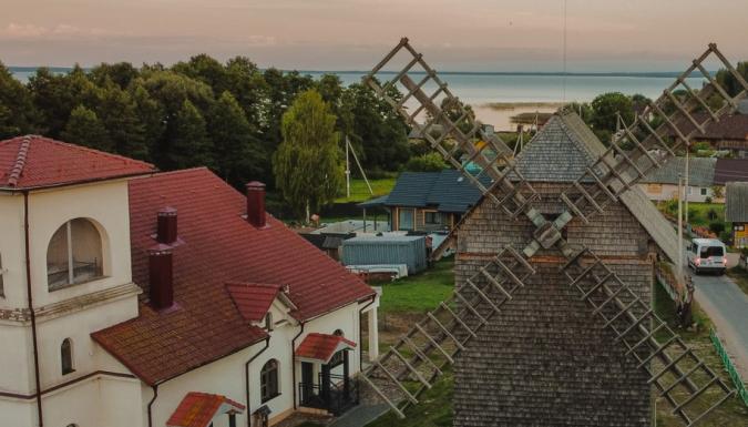 На небольшом отдалении от основных построек комплекса находится ОБЗОРНАЯ ПЛОЩАДКА, построенная в виде ветряной мельницы Голландского типа. С ее вершины открываются прекрасные виды на Нарочь, полуостров Наносы, живописный комплекс... Внутри этой мельницы увидим оригинальную коллекцию САМОГОННЫХ АППАРАТОВ — более полусотни экземпляров: от огромных до миниатюрных, от самых простых до невероятно сложных конструкций. Тоже часть материальной культуры народа... А буквально в трех десятках метров от смотровой находится ДОТ времен Первой мировой войны. Он прекрасно сохранился, если не считать повреждений, нанесенных во время ожесточенных боев, которые проходили здесь, на озере Нарочь, в десятых годах XX века.