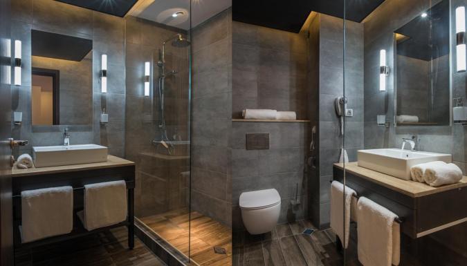 Ванная комната с душевой кабиной ( телефон, фен, полотенца, тапочки, банная косметика)