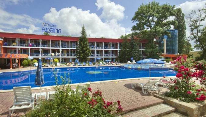 Отель Regina расположен в северной части курорта Солнечный берег, в 50 м от песчаного пляжа. Отель окружён парком. В здании 3 этажа (есть лифт), перед входом в здание разбит сад. Тип питания - ВВ, НВ. Есть ресторан, лобби-бар, условия для барбекю. К услугам гостей отеля большой открытый бассейн с детским отделением. Шезлонги, зонтики, полотенца бесплатно. При бассейне есть бар. Для ухода за собой и оздоровления можно посетить сауну, парикмахерскую, салон красоты или массажную студию, позаниматься в фитнес-центре. Есть также кабинеты терапевта и стоматолога, тату-салон. Рядом с отелем находится множество баров, ресторанов, магазинов, дискотек, ночных клубов и прочих развлечений. Из развлечений и спортивных занятий доступны бильярд, водные виды спорта, туризм, прогулки. Для детей предусмотрена детская площадка. Прочие услуги: автобусное сообщение между курортом и аэропортом и внутри курорта, сейф на рецепции, обмен валюты, химчистка, охрана территории, тур-бюро, парковка (платно), телевизор в холле, бесплатные газеты в холле, прачечная, магазин, интернет-кафе, прокат автомобилей, глажка одежды, бизнес-центр с переговорной, сад. Останавливаться с животными можно. Check-In 14:00 Check-Out 12:00