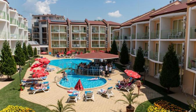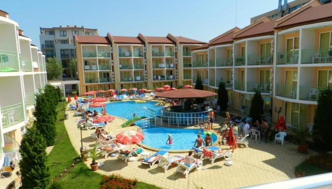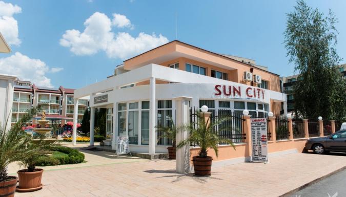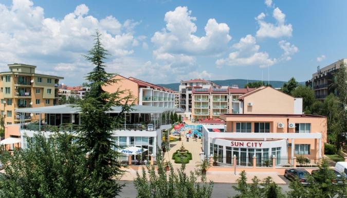 Отель Sun City расположен в тихом и спокойном месте в северо-западной части Солнечного берега в 300 м от пляжа и примерно в 800 м от центра курорта. На территории площадью 4500 кв.м есть небольшой красивый парк, который создаёт уютную атмосферу для отдыха. Рекомендуем для спокойного отдыха семей.