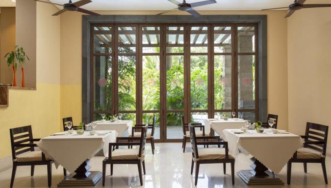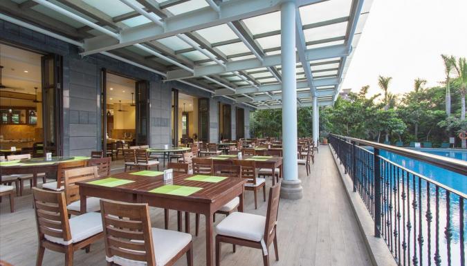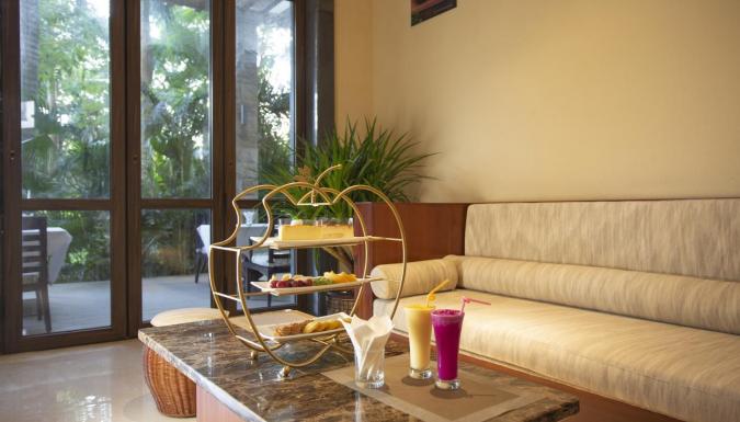 На тщательно ухоженной территории, утопающей в пышной тропической зелени сада, размещен открытый бассейн с террасой, оборудованной зонтами и шезлонгами.