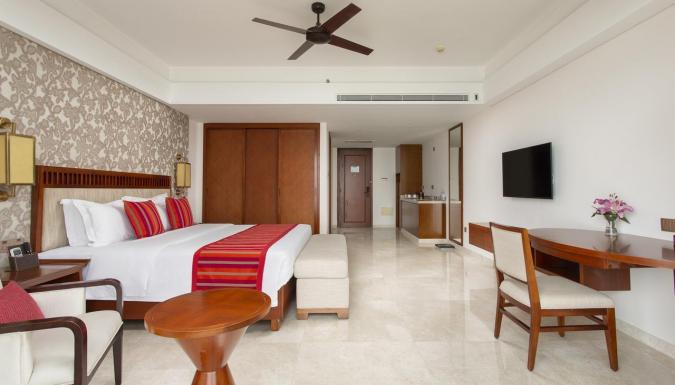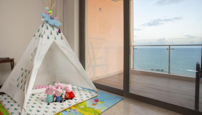 Представлены уютные комфортабельные номера от 47 м. кв. с балконом (не во всех номерах) и видом на море, в просторных семейных номерах от 49 м. кв. с гостиной, представлены тематически оформленные детские зоны с игрушками.