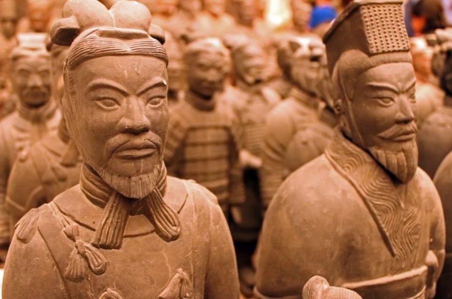 Терракотовая Армия из гробницы первого императора объединенного централизованного Китая Цинь Шихуана (221 г. до н.э.), 6000 скульптур терракотовых воинов и лошадей в натуральную величину провозглашены как «восьмое чудо света».
