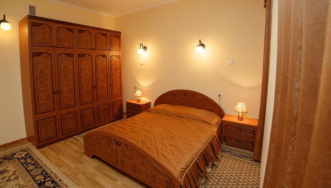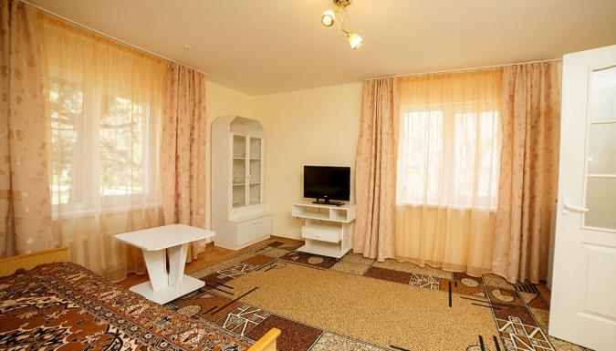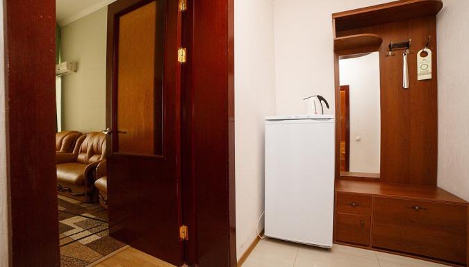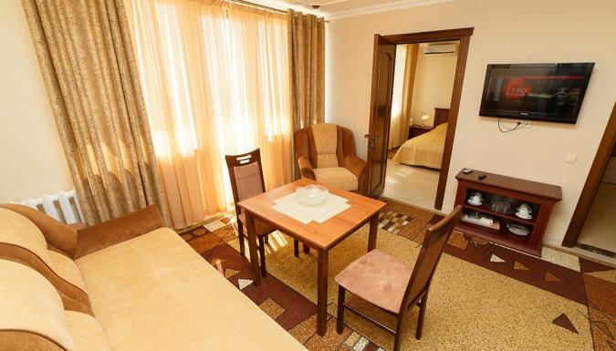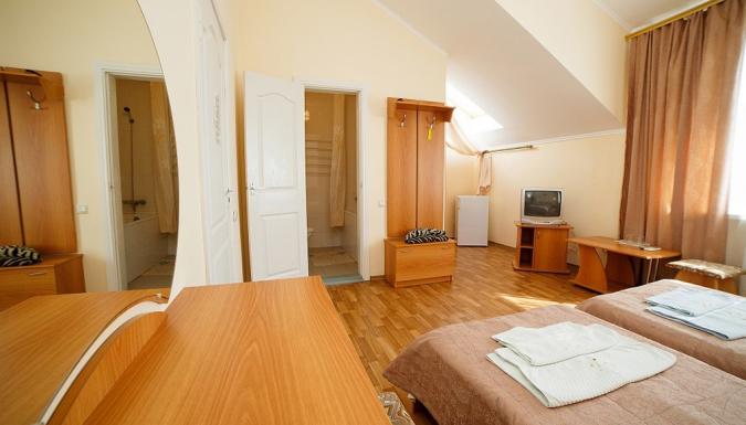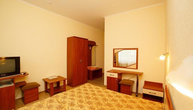 2-местный 2-комнатный люкс (макс. 2+2 чел., 26-28 кв. м, телевизор, кондиционер, ванна, холодильник, телефон, 2-спальная кровать, туалет, номера расположены на 1 этаже). Доп. место - диван, может быть предоставлен без ограничения по возрасту.