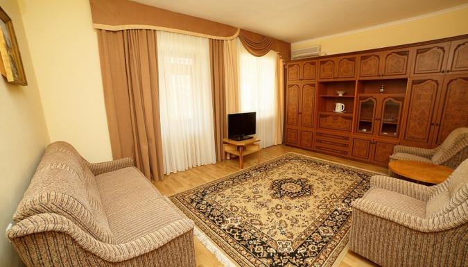 2-местный 3-комнатный люкс (макс. 2+2 чел., телевизор, кондиционер, ванна, биде, холодильник, лоджия, 2-спальные кровати, туалет). Доп. место - диван, предоставляется без ограничения по возрасту.