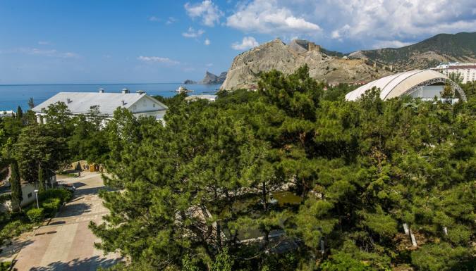 Территория здравницы является памятником садово-паркового искусства (площадь парка - 18 га) и расположена у подножия Генуэзской крепости.