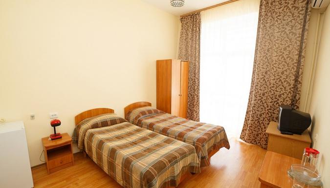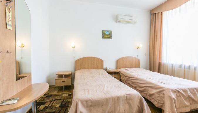 2-местный 1-комнатный номер (макс. 2+1 чел., 16 кв. м, телевизор, кондиционер, ванна, холодильник, 1-спальные кровати, туалет, номера расположены на 3 и 4 этажах лечебного корпуса). Доп. место - раскладушка, может быть предоставлена для ребенка до 14 лет.