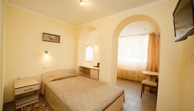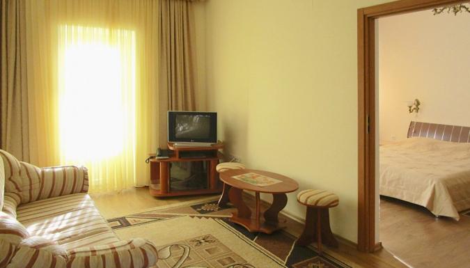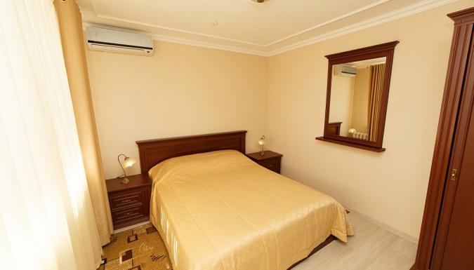 2-местный 2-комнатный люкс (макс. 2+2 чел., телевизор, кондиционер, ванна, биде, холодильник, лоджия, телефон, 2-спальная кровать, туалет). Доп. место - диван, может быть предоставлен без ограничения по возрасту.