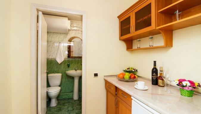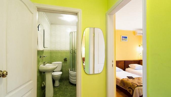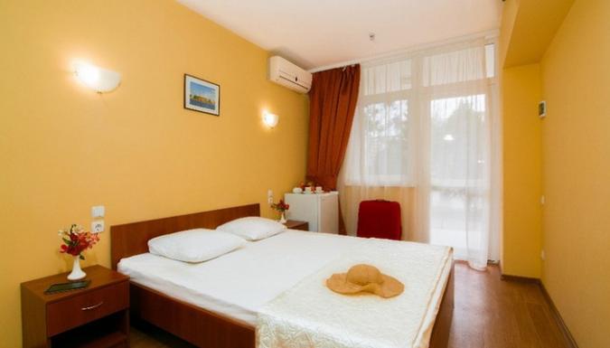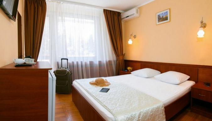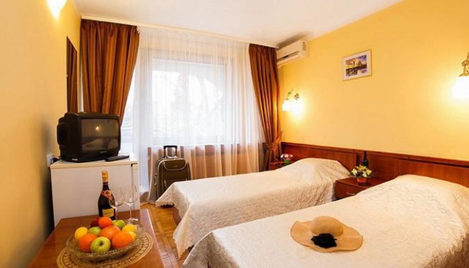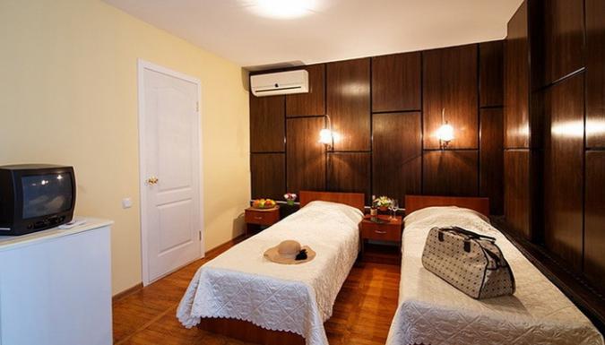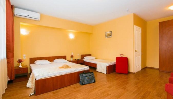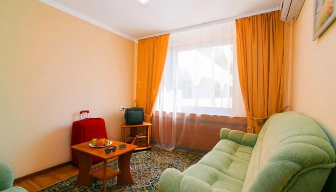2-местный 2-комнатный полулюкс (макс. 2+1 чел., 21 кв. м, телевизор, кондиционер, душ, фен, балкон, электрочайник, мини-бар, мягкая мебель, утюг, гладильная доска, 2-спальная кровать, туалет, номера на 2, 3 и 4 этажах). Доп. место - диван, может быть установлено без ограничения по возрасту.