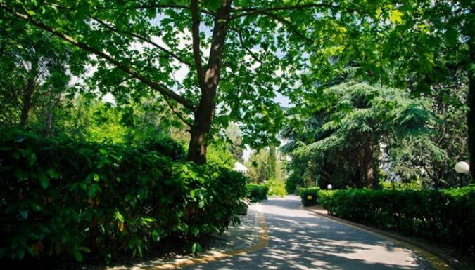 Пансионат находится вблизи центра Алушта, но в тоже время прячется в тенистой парковой зоне, куда не доносятся звуки музыки, шума, аттракционов. У подножия горы Демерджи. Утопает в вековой зелени Приморского парка на территории более 4.5 га.