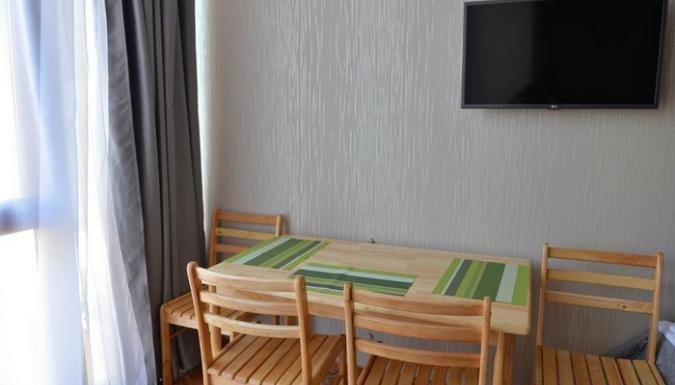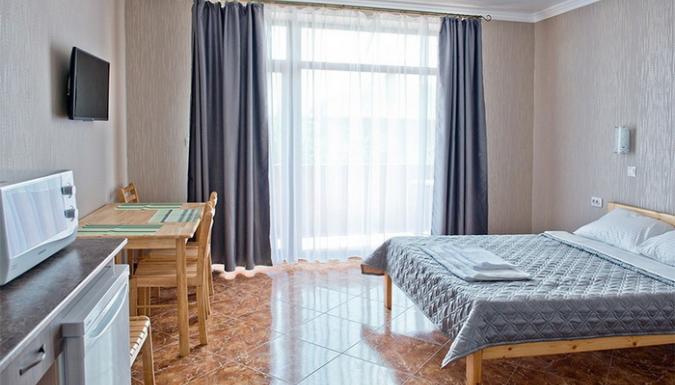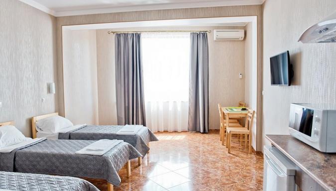 3-местный комфорт (макс. 3 чел., 17-20 кв. м, Wi-Fi, телевизор, кондиционер, душ, фен, холодильник, электрочайник, микроволновая печь, сейф, утюг, набор посуды, туалет, полотенца для бассейна, этаж 1-4; балкон (вид на море, горы и окрестности / на детскую площадку) или мини-балкон (вид на внутренний дворик с бассейном); одна 2-спальная кровать и две 1-спальных или три 1-спальных кровати).