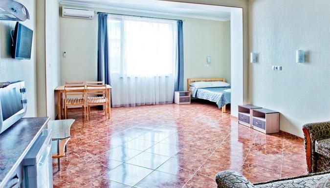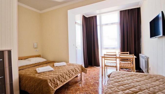 4-местный комфорт улучшенный (макс. 4 чел., 23-25 кв. м, Wi-Fi, телевизор, кондиционер, душ, фен, холодильник, балкон, электрочайник, микроволновая печь, сейф, утюг, набор посуды, туалет, полотенца для бассейна, этаж 2-4; одна 2-спальная кровать и один раскладной диван).