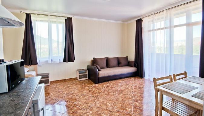 6-местный семейный (макс. 6 чел., 33 кв. м, Wi-Fi, телевизор, кондиционер, душ, фен, холодильник, электрочайник, микроволновая печь, сейф, утюг, набор посуды, туалет, полотенца для бассейна, этаж 1; одна 2-спальная кровать и два раскладных дивана).