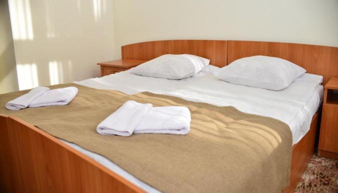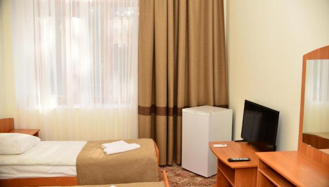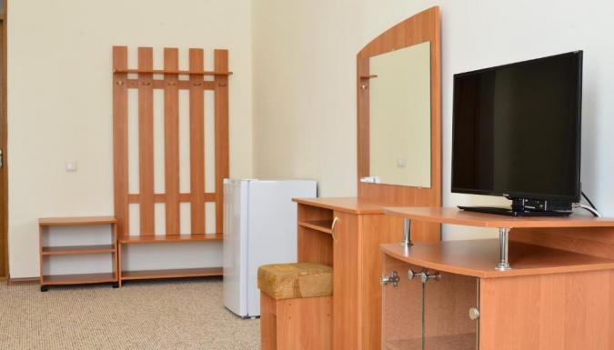 Номера всех категорий оборудованы санузлами с ванной или душем, установлены кондиционеры, имеются холодильники и телевизоры и wi-fi, набор необходимой мебели (кровати, стол, стулья, зеркало, вешалка, шкаф)