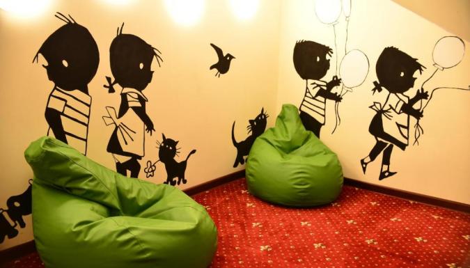 Для гостей предусмотрен детский уголок - это небольшая часть холла, где дети играют под присмотром родителей. В детском уголке для игр есть: столики, пуфики, цветные мелки, доска для рисования, разнообразные игрушки, лего, мячи, машинки, раскраски, цветные карандаши, детский вигвам, детский надувной круг и спасательный жилет для плавания.